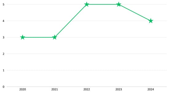 In Figure 8, a clear upward trend is observed in the number of publications between 2020 and 2024, with peaks of five articles in both 2022 and 2023, years in which research on visual ergonomics, operational efficiency, and HMI interaction deepened. In 2020, three studies marked the post-pandemic onset of interest in visual ergonomics; in 2021, three additional works explored co-design and collaborative systems. The year 2022 reached five publications, and 2023 maintained this level with research on digital workflows and usability in robotics. Finally, in 2024, four articles were added, confirming the sustained focus on ergonomic UI/UX design.