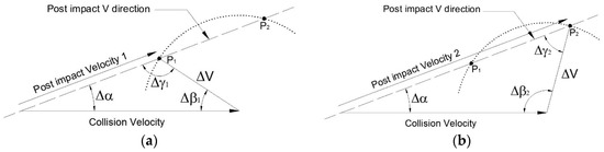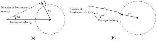 Let us consider one vehicle only. By a completely analytical approach consisting in the use of trigonometric rules (law of sines) applied to the triangles defined by , Δα and (Equation (11)), it is possible to evaluate the (Equation (12)). Figure 3a,b show the possible solution of the post-impact velocity: the subscript i indicates that the equation applies for the case in Figure 3a (i = 1) and in Figure 3b (i = 2). Since , Δα and ΔV are known, Δγ1 = π − Δγ2.