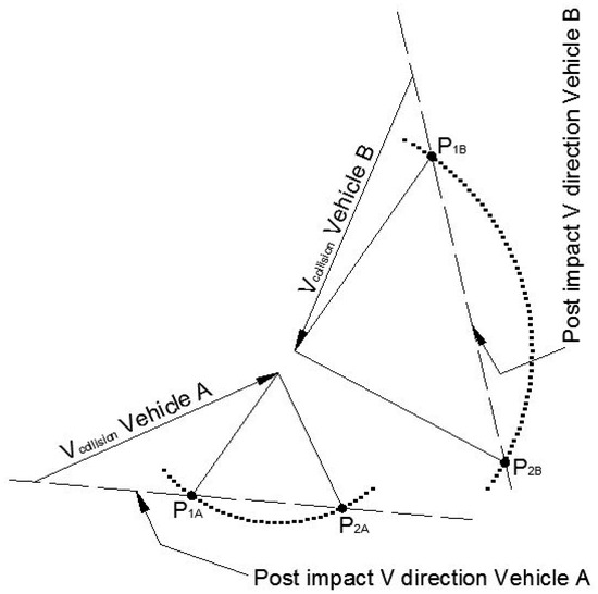 From the final point of the collision velocity vector, an arc of a circle with radius equal to can be drawn, which identifies two different intersections in points P1 and P2 on the post-impact velocity direction, as outlined in Figure 2. The choice between the two possible solutions could be carried out considering that direction must be (approximately) the same for both vehicles involved in the accident. The graphical check consists in the comparison between the two triangles, evaluating if it is possible to highlight this : if so, for the vehicles can be obtained, otherwise velocity triangles are inconsistent. In Figure 2, it can be seen that point P1 represents the correct solution for both vehicles.