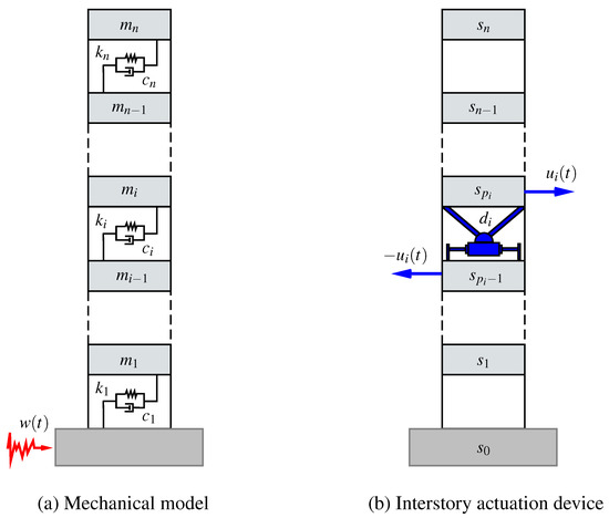 (a) simplified mechanical model for an n-story building with story masses , stiffness coefficients and damping coefficients , ; and (b) interstory actuation device. The actuation device is implemented at the building position between the stories and . The interstory actuator produces a pair of opposite structural forces of magnitude on the supporting stories and .
