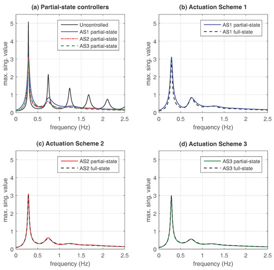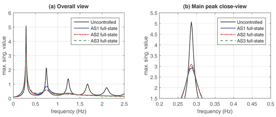 and the corresponding frequency responses are displayed in Figure 3. Looking at the overall view presented in Figure 3a, it can be appreciated that the three controllers produce a significant reduction of the building resonant peaks. In accordance with the obtained -values, the plots in Figure 3b show that a slightly higher performance is attained by the concentrated actuation scheme AS1 with the controller in the main resonant peak. However, looking again at the overall view in Figure 3a, it should be noted that a better behavior is exhibited by the distributed actuation schemes AS2 and AS3 in the second resonant peak. The -value corresponding to the uncontrolled system is . The relative -value reductions with respect to the uncontrolled building response attained by the optimal full-state controllers are collected in Table 2.