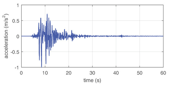 Ground acceleration disturbance. North-South Kobe 1995 seismic record scaled to an acceleration peak-value of 1 m/s.
