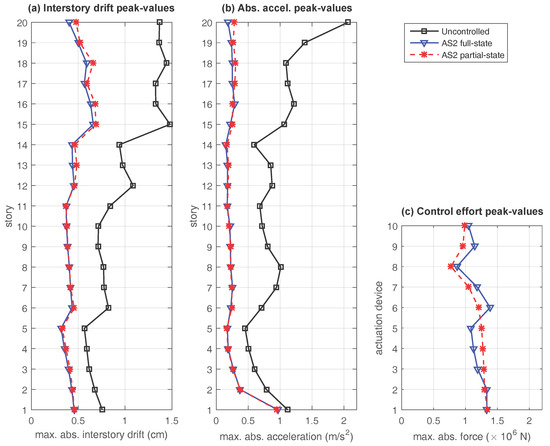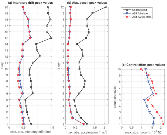 Looking at the plots in Figure 6, Figure 7 and Figure 8, the following facts can be appreciated: (i) all the proposed controllers provide a good level of reduction in the interstory drift and absolute acceleration peak-values with respect to the uncontrolled response; (ii) for the distributed actuation schemes AS2 and AS3, the behavior of the full-state controller and the partial-state controller are very similar; and (iii) for the concentrated actuation scheme AS1, the interstory drift peak-values produced by the partial-state controller are slightly smaller than those attained by the full-state controller. However, significantly larger control-effort peak-values are also required by the partial-state controller. These time-response results are entirely consistent with the frequency-response characteristics observed in Section 3, and indicate that the performance of the partial-state controllers is not affected by the reduced feedback information in the distributed actuation schemes AS2 and AS3. In contrast, a noticeable loss of performance can be observed in the partial-state controller corresponding to the concentrated actuation scheme AS1. The same facts can be appreciated by looking at the data collected in Table 3 and Table 4, where it becomes apparent that larger percentages of reduction in the interstory drift peak-values are attained by the distributed actuations schemes AS2 and AS3 with smaller control-effort peaks. Particularly remarkable is the performance of the fully-distributed partial-state controller , which produces larger reductions in the interstory drift peak-values than the full-state controller and, at the same time, requires a maximum control-effort peak-value that is a 23.1% smaller than the one required by the concentrated full-state controller .