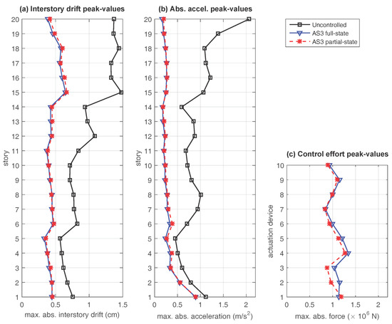 To illustrate the time-response characteristics of the proposed partial-state controllers, a suitable set of numerical simulations has been carried out using the scaled Kobe 1995 seismic record as ground acceleration input (see Figure 5). For the concentrated actuation scheme AS1, the absolute peak-values of the interstory-drifts, story absolute accelerations and control efforts corresponding to the different control configurations are presented in Figure 6, where the black solid line with squares presents the response of the uncontrolled building, the blue solid line with triangles corresponds to the full-state controller defined by the state-feedback control matrix and the red dashed line with asterisks represents the partial-state controller defined by the output-feedback control matrix . The time responses corresponding to the semi-distributed actuation scheme AS2 and the fully-distributed actuation scheme AS3 are presented in Figure 7 and Figure 8, respectively, using the same colors, line styles and symbols. To complement this graphical information, the percentages of reduction in the interstory drift peak-values with respect to the uncontrolled response at selected levels of the building (see Remark 3) are collected in Table 3, and the maximum control-effort peak-values are presented in Table 4.