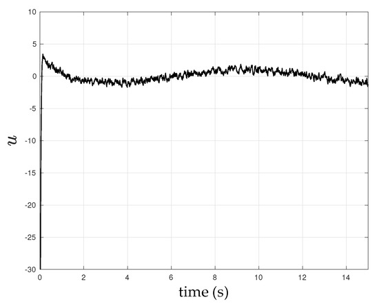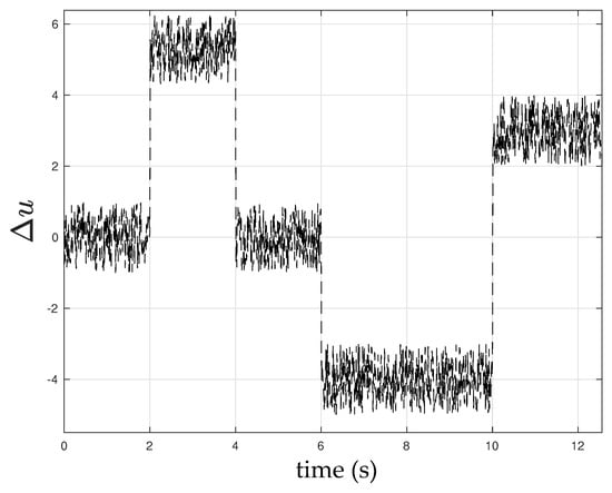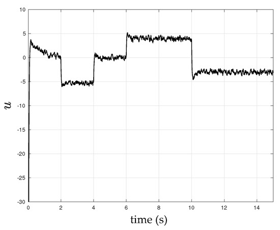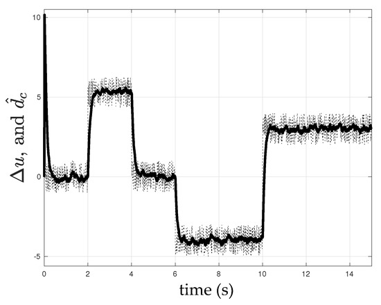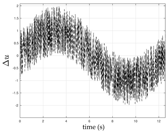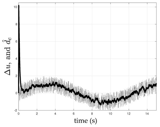 Paying attention to , which influences the system through the control matrix the same as the control input , it is reasonable to consider that it would be able to design a controller that is based on a regular control input with an extra element such as to counteract the influence of completely if were available. While it is impossible to catch the real value of as a whole, it is still desirable to employ some information of , even partially, to counteract its influence on the system as much as possible. On the other hand, some existing works have shown that we are able to estimate under the condition of [22,23], which means that must be a constant, or precisely, not a time-dependent function. Though such a condition is evidently strict from the point of view of dynamic control systems, in fact, as pointed out by Wu and Han [23], the condition can, not theoretically, but practically, be extended to cases such as the piecewise-constant case and the slowly time-varying case (). However, when it comes to a sharply time-varying case, it is clear that the condition cannot be tolerated anymore.