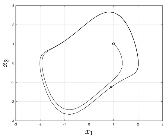 Without control and uncertainty, i.e., and , the phase plane is shown in Figure 3, where the circle is the initial point and the square is the end point. It is clear that the unforced system is unstable.
