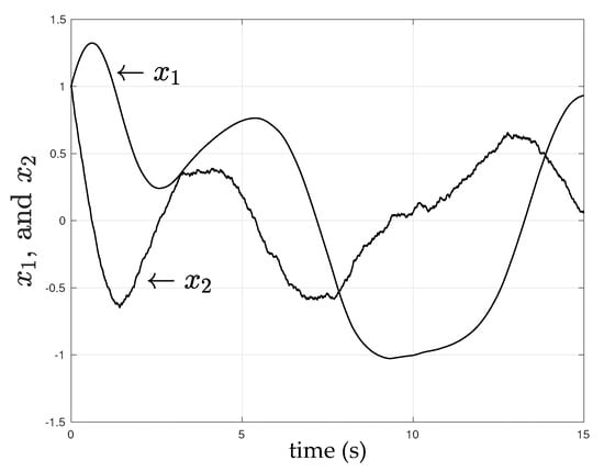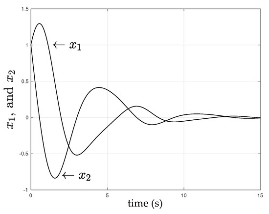 As for in (5), we set , , and . Following Step 1 in Theorem 1, we have , by solving LMIs by (35). Then, following Step 2, we have by solving LMIs (20) and (32), where in (37) is set to be 100 in order to get a larger observer gain. It is obvious that L will be if we set