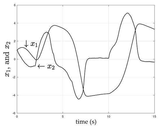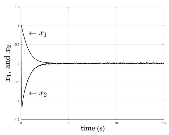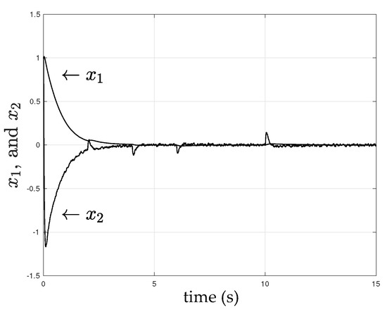 Solving the above LMIs, we have , for the regular PDC controller in (41). The control performance of the regular controller is shown in Figure 4, where the uncertainty is not considered, i.e., , where the initial state is set to be . It is clear that the regular controller is able to stabilize the unstable system when the uncertainty is not considered.