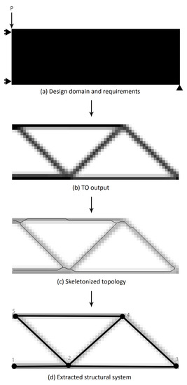 In this study, the design constraints for two established problems from the structural optimization literature were used as a basis for TO. Structural systems were then manually extracted from the topologies, and the performance of these systems was compared against benchmark optimized solutions from the literature. This study was performed in order to validate the initial idea of generating structural systems using TO. The design problems shown in Figure 6a and Figure 7a were used as input for TO, and extracted systems were compared with the results published by [,,,,]. It is important to clarify that the solutions in these previous works were obtained by starting from an initial structural system, and iteratively optimized by adding members, removing members and, in some cases, modifying node locations. These variations to the structure were introduced as per optimization heuristics such as a genetic algorithm, particle swarm optimization, or differential evolution.