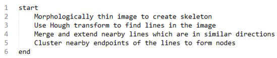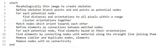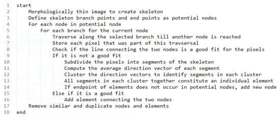 As with the NEI-CL algorithm, the topology is first converted into a morphological skeleton, and branch and endpoints are determined. The Hough transform [,], a well-established method for finding line segments in images, is then applied. Given the assumption that all structural elements will connect between nodes in a straight line, lines found through the Hough transform are labeled as candidate structural elements. Duplicate endpoints of lines are merged using k-means clustering and line segments with similar directionality and endpoints are joined to form a single element. The pseudo code for this algorithm is shown in Figure 3.