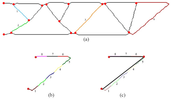 Six different values of the bandwidth parameter α, from 2 pixels to 12 pixels, were tested. In the results shown, an α value of 4 was used. It was observed that the impact of this parameter on the resulting system is not significant since the main purpose of this parameter is to make the algorithm faster. Once the pixels from the traversal are determined, there are two ways of processing it. If the line connecting the end point nodes is a good fit, which is true if no pixel is more than α pixels away from a line, then an element connecting the nodes is added (Figure 5, line 15–16). If the fit is not good, then a clustering approach is used (Figure 5, line 9–14). If α is too small, then the clustering approach is used more frequently resulting in a slower runtime. Furthermore, the clustering approach can determine different endpoints from the existing nodes and hence create additional nodes. However, after removing similar nodes, the final nodes and elements obtained did not change significantly as seen for TO3 (Figure 13a).
