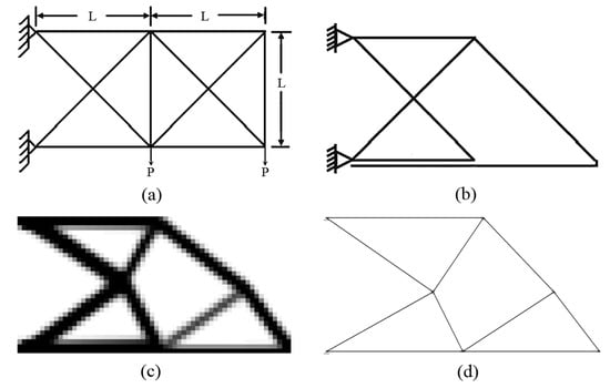(a) initial structure for prior solutions to Problem 2; (b) optimal solution from []; (c) TO solution; and (d) TO solution converted to truss. Note the additional members needed for stability.