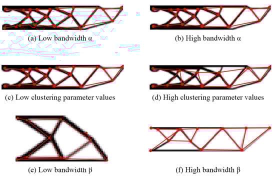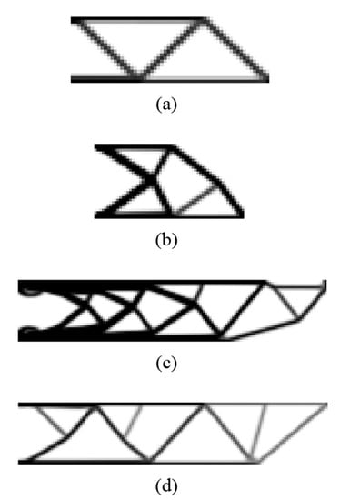 The TO solution to Problem 2 was compared with the designs published in [,]. In both of these studies, an initial structure was assumed for optimization. The node locations could be modified, but member removal was not permissible. The area of cross-section of the members could also be modified to optimize the structure. For the topology optimization, the volume ratio was set to 0.2.