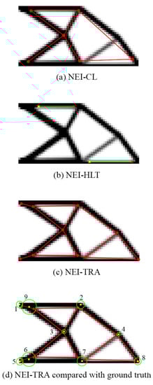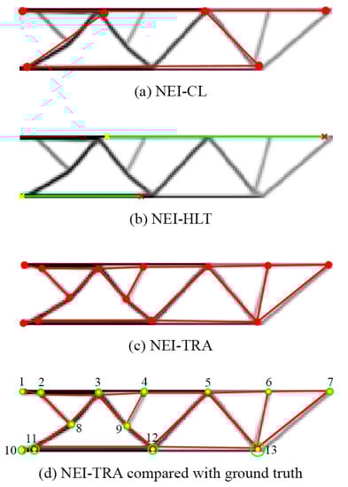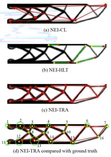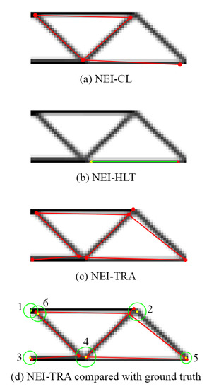A comparison with the ground truth (Figure 10d) showed that the performance of the NEI-TRA algorithm was superior. It identified the nodes accurately in all cases. Multiple nodes along with an extra element were detected at two joints in the structure due to the skeleton having multiple branch points in the vicinity of that joint. The algorithm correctly detected only one node in the top left corner, whereas 50% of the ground truth labels had two nodes at this joint.
