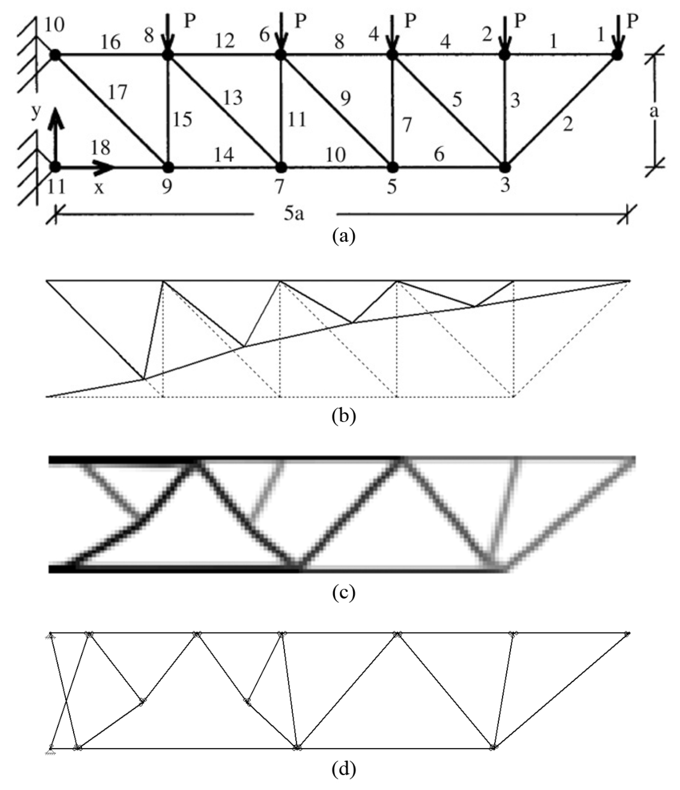 (a) initial structure for prior solutions to Problem 1 []; (b) optimal solution from []; and (c) TO solution; and (d) TO solution converted to a truss.