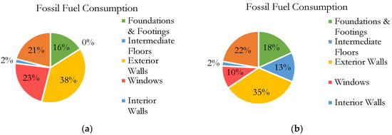 LCA reports include environmental impacts in seven (7) categories. For the baseline analysis (Figure 6a), the assembly with the highest negative impact in terms of fossil fuel consumption, global warming potential, eutrophication potential and smog potential is the exterior walls. Meanwhile, the windows have a greater negative impact on acidification potential and human health criteria. Exterior walls are the assemblies that have the highest fossil fuel consumption. For the high-performance model (Figure 6b), the assemblies with higher negative impact on fossil fuel consumption, global warming potential, acidification potential, eutrophication potential and smog potential are the exterior walls. The windows have a greater negative impact on acidification potential and human health criteria. The foundations and footings in the assembly have the highest ozone depletion potential.