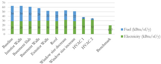 The next series of improvements include changes to the HVAC system, which is where the greatest impact to EUI is expected. When the model changes to a different HVAC system, the EUI drops significantly to 38 kBtu/sf/yr. The new HVAC system, Residential 14 SEER/8.3 HSPF Split Package Heat Pump, uses electricity and, according to this stage in the analysis, the use of electricity represents 90% of all energy used. However, the amount of consumed electricity increased 1 kWh/sf/yr (around 3.142 kBtu/sf/yr). Water heating becomes the only remaining use of fuel, and electricity is now being used for both space heating and cooling. This last improvement to the building’s chosen HVAC system is a Residential 17 SEER/9.6 HSPF Split HP < 5.5 ton. Using a more efficient HVAC (electric power) decreases the EUI even more to 35 kBtu/sf/yr, while the demand for electricity for space heating and cooling is also reduced. For a better understanding of the energy usage change along with all improvements, Figure 7 graphically shows the reduction of fuel and electricity during a year. Please note the benchmark used for comparison in the figure is a Living Building Challenge case study (Mission Zero House) [18].