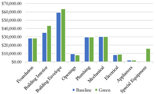 Cost estimates to both models are performed by using Assemblies Cost Data [19] and Green Building Cost Data [20]. All the building elements were taken into account for the cost estimate including foundations, building interior, building envelope, openings, plumbing, mechanical, electrical and appliances. The total cost of the baseline building was calculated to be $203,779.30 ($133.19/sf) while the cost of the high-performance building was $231,658.54 ($151.41/sf). Figure 9 presents a comparison of costs in each building section. According to the results, the first cost of the high-performance model is 13.68% more than the baseline model. To make the high-performance model affordable, the payback duration of improvements and the decrease in the utility bills will be calculated.