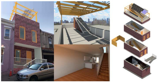 Affordable energy-efficient houses have many benefits, such as reducing greenhouse gas emissions, decreasing pollution, improving air quality and thermal comfort, and conserving resources. Reduced energy costs are added benefits to ensure affordable housing budget targets are met. According to the EPA, an Energy Star home can reduce its energy use up to 30% or $600 per year on average [5]. However, as mentioned above, there are additional experiential and social benefits that are often not achieved in other affordable projects that pursue the TBL. To actualize these economic, environmental and social benefits, major cities need a new holistic prototypical integral sustainable home design to promote affordable energy-efficient housing in low-income neighborhoods. This study proposes and tests the new approach to affordable and energy-efficient design for a low-income rowhouse in Philadelphia, which has the highest poverty rates among the 10 largest cities in the U.S. [6] (see Figure 1). The design aims to be replicated as an investment in the future where people live in a sustainable and efficient home with net zero energy and zero emissions. The value proposition for this home is more than energy efficiency and a small payback period, but rather the technological, energy and social resilience the project aims to add to a typical affordable home by providing choice and redundancy: how to spend money in the community to further one’s values using funds saved from installing technology; to remain with power while others are blacked out due to storms; and the back-up provided by the ability to purchase electricity from the grid in the event the onsite generation does not provide enough. The methodology includes the proposed low-income green housing design in Philadelphia accompanied by guiding principles and green goals. The research approach consists of design development with certain restrictions in terms of location, use, sustainability goals and cost. Then, the proposed design is analyzed and compared to a baseline case. In each step of the comparison, the proposed design is improved to make it more sustainable, especially in terms of energy use. Life-cycle assessment (LCA) and cost analysis were performed in the proposed model to evaluate building assemblies, as well as affordability of this design in the low-income neighborhood. The scope of this study is limited to high-performance residential design in terms of energy efficiency and affordability.