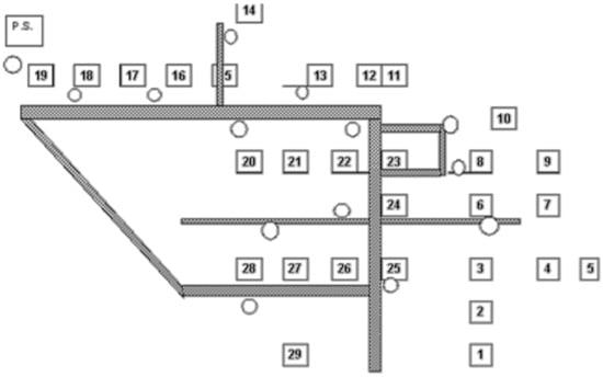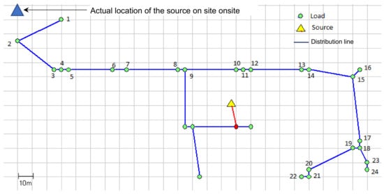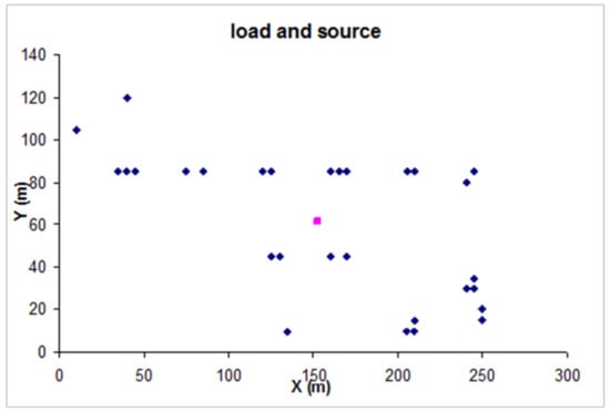 The map of the village and the load magnitudes are used to calculate the location of the source which reduces the total losses (using the centre of moments approach). The load points and the PV system location determined are shown in Figure 18. These are given as input to ViPOR for determining the network structure. In the ViPOR simulation, the connected load is clubbed at some points where the distance between the houses is less than 5 m. The optimum network structure obtained using simulated annealing is shown in Figure 19. The actual source location at the village site is also shown. Evidently, the actual source location is not optimum as the total loss in the system is not minimized.