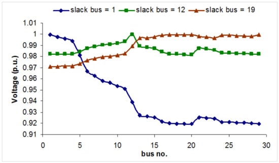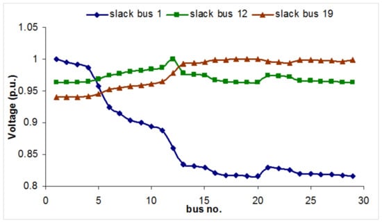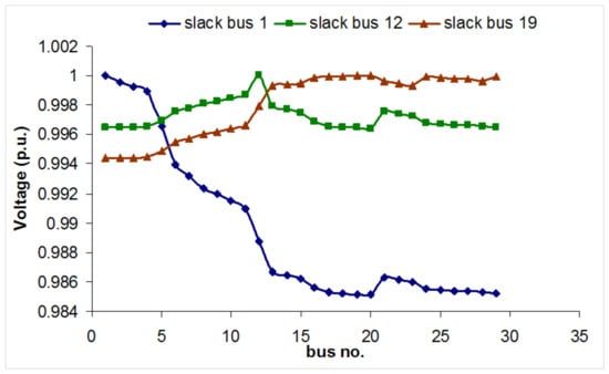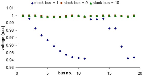 From Figure 14 it can be observed that even when the load is increased to 10 kW the voltage drop remains within limits when the PV source is connected to bus no. 12 as compared to bus no. 1. This confirms that the PV source location and network structure determined in Section 4.1.1 and Section 4.1.2 are optimal.