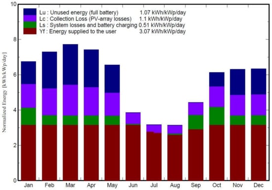 The PV system and battery sizes (8.9 kWp and 48 V, 5400 Ah, respectively) obtained from pre-sizing were used as inputs to both PVsyst™ and PVGIS5 online software. The meteorological data of Rajmachi village (Latitude 18.826° N, Longitude 73.396° E) was imported into PVsyst™ from the PVGIS Climate SAF database. Figure 22 shows the monthly PV energy output simulated by PVGIS5 for a typical meteorological year normalised per kWp. Figure 23 shows the monthly PV energy output estimates normalised per kWp obtained from the detailed PVsyst™. The PV array size had to be increased to 9 kWp to match with commercial module specifications from 8.9 kWp. The figure also shows PV array losses (due its orientation, module temperature and insolation coefficients etc.), the rest of system losses (due to Maximum Power Point Tracking (MPPT), due to battery charging and discharging etc.) and PV energy unused (due to battery being fully charged). A detailed description of the losses and the calculation methodology is available on PVsyst’s user manual and the software vendor’s website.