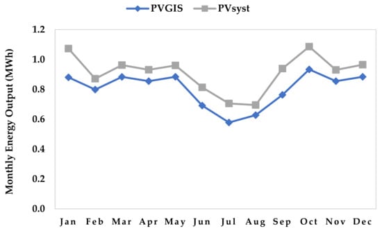 The seasonal variation in PV energy output obtained from both software are very similar. From a comparison of the monthly energy outputs as shown in Figure 24, it was observed that the output estimated by PVGIS is marginally lower than that from PVsyst™. Over the year, PVGIS energy outputs were 12% lower than PVsyst™ on average. This is expected as the PVsyst™ design is detailed and uses data of commercially available PV modules and batteries whilst PVGIS is based on generic PV and battery models. As PVGIS online tool does not overestimate PV generation potential, it could be a viable alternative in the absence of detailed design software like PVsyst™.