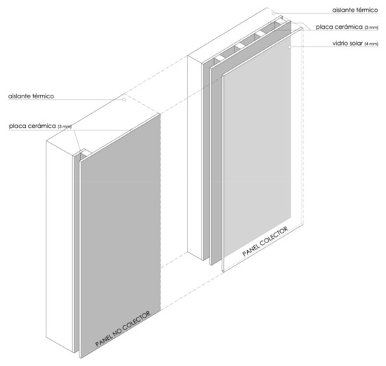 Once the general configuration of the new STC is established, an initial block of tests are undertaken, based mainly on the material choice and corresponding thicknesses. The thicknesses of the inner chambers are defined (the infrared trap and internal circuit for the flow of heat-transfer fluid), as well as that of the materials used for the collector panel itself (ceramic absorber plate, thermal insulation, and glass). Also, at the same time, through the construction of small prototypes, the energy performance of the collector is analyzed, as well as the system used to attach and install the panels on the facade.