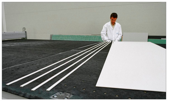 As has already been mentioned, ceramic plays a fundamental part in the design of this system. Therefore, it is necessary to use a product that is capable of adapting to the technical, architectural, and energy needs of the project. A thin porcelain slab with a large surface area, known commercially as Laminam (The product Laminam was created in 2001 by the engineer Franco Stefani), meets the requirements. The format measures 1000 mm wide, 3000 mm long, and 3 mm thick, and offers a wide variety of finishes and colors both for offering an interesting architectural range and achieving efficient absorbencies in the darker colors [3]. Due to its large surface area, floor-to-ceiling collector panels can be employed, and because of its reduced thickness, it is very lightweight (Figure 2) and can be easily and accurately cut to create the interior partitions of the collector.
