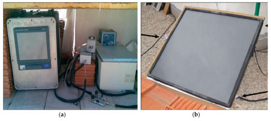 To validate the configuration of the proposed ceramic collector panel, its energetic viability was tested in accordance with the applicable regulations on thermal solar energy collectors [5]. In this test, a prototype measuring 1000 × 1000 mm was made using the materials and results obtained from the previous tests. To obtain the energy data, a specific experimental motorized device was used based largely on a thermostated bath, a membrane pump, a flowmeter, three thermoresistors, a pyranometer, and an anemometer (Figure 3).