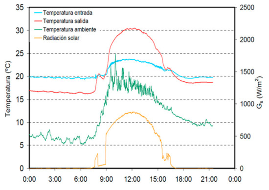 To determine the efficiency of the ceramic solar collectors, a specific experimental assembly was used. The evolution of some of the parameters obtained (ambient temperature, solar radiation, and temperature of inlet and outlet water), during a typical sunny February day, are of particular interest, and verify the collector’s correct performance when receiving sunlight.