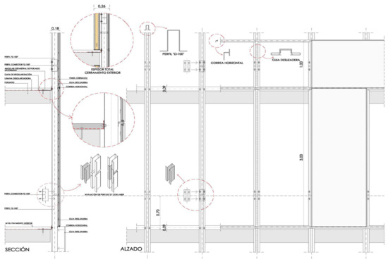 As well as these aspects, it is also worth adding that the constructive system must be capable of absorbing possible structural movements, acting independently of the inner skin to avoid the existence of acoustic bridges, and offer a final thickness for the facade surface (collector casing + support + internal finish) of no more than 30 cm, to remain competitive in today’s market. Under these premises, a constructive system has been developed with a total of five different metal profiles, three of which are in formats that exist on the market today (found in basic catalogues of metal profiles). This last factor has very favorable repercussions on the final cost of the system [10].