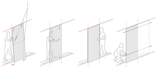 The emplacement of the panels follows the sequence shown in Figure 7: first insert the panel in the upper horizontal groove, and swing inwards until it inserts into the lower guide. The panel is then slid along this lower guide until it meets its neighboring section, the panel now being held alone between the horizontal slide rails. The panels are then fixed to the anchor points prepared on the uprights.