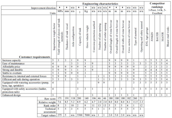 A house of quality matrix expresses the different engineering targets that need to be achieved for a new product design by considering customer needs, marketing research, and benchmarking information. Figure 3 shows the house of quality matrix for an agricultural water bowser. A product improvement survey was carried out and farmers were requested to indicate the level of importance of various aspects of an integrated chassis water bowser. Agricultural water bowsers from five different companies have also been compared to each other based on the different customer requirements.