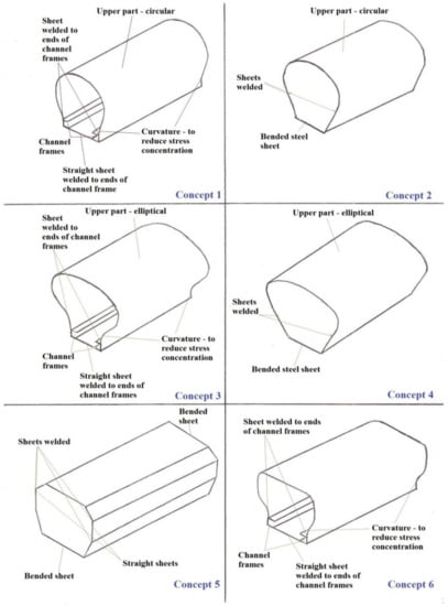 Six different concepts of tank were considered and the best design was selected using the Pugh matrix. Pugh’s method is a decision-making technique used to select the best concept from alternative concepts by making qualitative and quantitative comparisons [24]. The base of the tank, which would be stiffened accordingly in the product improvement phase, replaced the chassis in all the proposed tank designs shown in Figure 4. In Concept 1, two channel frames were placed parallel to each other. The extreme edges of the top circular sheet were welded along the top edges of the channel frames. The two extreme edges of a rectangular metal sheet, which was at the bottom, were welded to the edges of the channel frames. The curvature geometry near the top of the channel frame reduced the stress concentration. In Concept 2, a bended steel sheet was welded to a top circular sheet. The angled side walls allowed for more space inside the tank, and therefore had a higher capacity as compared to Concept 1. Concept 3 and Concept 4 had elliptical top surfaces, and the steel sheets were arranged in the same way as those in Concept 1 and Concept 2, respectively. Elliptical geometry has a lower center of gravity as compared to circular geometry. Concept 5 shows a tank with an octagonal cross section, which was wide and had a large volume, whereas in Concept 6 the arrangement was similar to Concept 1 and Concept 3, but with a different cross section.
