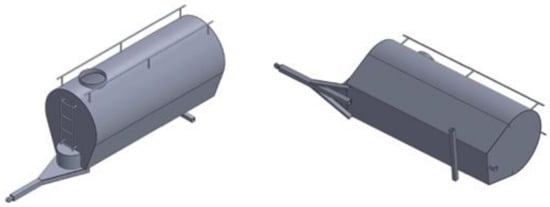 The agricultural water bowser was modeled using SolidWorks 2015 software. Two pictorial views of the model are shown in Figure 10. The thickness of the shell was 6 mm. A platform and a ladder were welded to the front face. There were 2 parallel rails on the top so that watering hoses could be kept in between them. An opening on the top allowed the bowser to be filled and a hollow tube having a diameter of 100 mm was welded to the back face, where a valve and sprinkler could be connected. The length of drawbar under the shell was 275 mm. For static structural analysis, the model was simplified by removing the ladder, the top rails, and the small hollow tube at the back, as they have negligible effect on the structural integrity of the bowser.