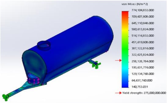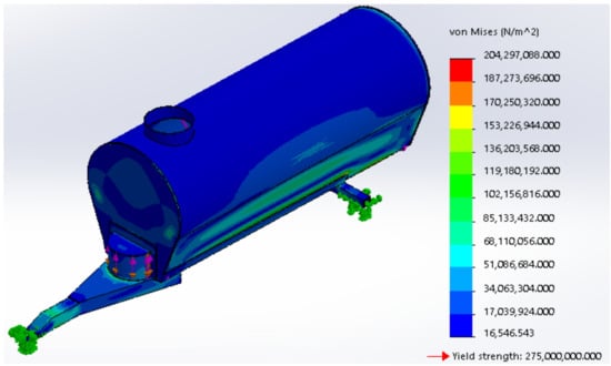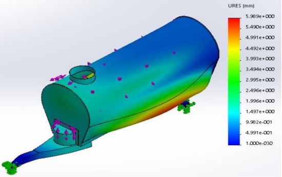 The 3-D model was modified accordingly, and the resulting stress obtained at any point on the agricultural water bowser was below 205 MPa, as shown in Figure 12. The maximum deformation was 6 mm, and occurred at the bottom edges of the bowser where the axle was connected to the tank (Figure 13).