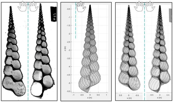 Cross-sectional scan of shell halves (left); MATLAB generated the model using the specimen’s parameters (center); and digital overlays of each half (right). The hand symbols represent the opening of the shell into two halves.
