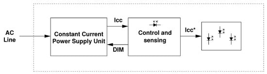 In a typical solid state lamp, represented in Figure 1, a Power Supply Unit (PSU) convert the AC line voltage to a DC constant current. Usually, this current is not perfectly constant, and it is slightly modulated at two times the AC line frequency, in order to satisfy High Power Factor (HPF) requirements. A single stage Power Factor Correction (PFC) is used, in order to minimize PSU cost in low power LED lamps (1–50 W). At higher power levels, a two stage power supply can be used, in order to reduce light flickering. The first stage is a PFC, and the second one is constant output current DC/DC converter. LEDs are then directly fed by the PSU. Finally, the PSU, if dimmable, has a control input (DIM), used to change the amount of light emitted by the lamp. Several standards exist to control lamp power, like DALI, 0–10 V analog control, or variable duty cycle PWM.