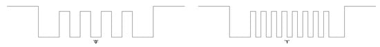 If communication is needed, instead, a modulation scheme must be introduced. The chosen approach is based on the emission of few pulses by the LEDs, injecting a controlled current. Zeros and ones are represented by a different number of pulses at different frequencies. A key point is that the total energy must not change, in order to avoid visible luminance changes of the lamp as a function of the transmitted pattern. As an example, the two different modulations can be four pulses at 100 kHz, and eight pulses at 200 kHz to represent ‘0’ and ‘1’, respectively (Figure 3).