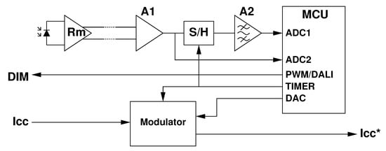 The aim of this work is to design a block that could be easily customized to a variety of lamps, different for power, size, and shape. From this point of view, it is mandatory to have a circuit with minimal complexity, but capable of operating in a broad range of operating conditions too. In the proposed solution (Figure 2), a control and sensing unit are interposed between the PSU and the LEDs. This block has the task to allow accurate Ambient Light Sensing (ALS), and, at the same time, to modulate emitted light in such a way to allow Visual Light Communication (VLC). The light sensor is a photodiode, which act both as a sensor for ambient light and as a receiver for optical signals coming from other lamps. The photodiode has an integrated optical filter, in order to resemble human eye responsivity. This does not compromise receiver sensitivity, as typical white LEDs have good emission in the green region of visible spectrum, where a photodiode filter has good responsivity too.