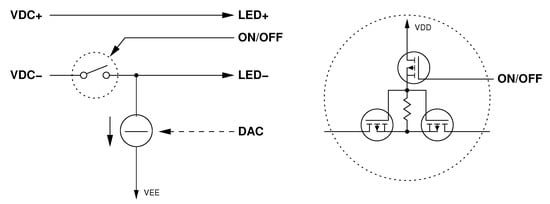 Light modulation is implemented by the modulator block of Figure 4. It transforms the constant current , fed by the PSU, into , sent to the LEDs. A simplified schematic is visible in Figure 5. It is basically a switch, used to interrupt the current flow from the lamp PSU, and a current generator, driven by the DAC output of the MCU. The current generator is implemented through a current mirror with gain. The gain is needed as LEDs driving current are typically two orders of magnitude greater than the output current capabilities of the DAC. The switch is implemented through a pair of source coupled NMOS transistors. This topology cancels the presence of the body diodes, allowing for blocking current flow in both directions when switch MOSFETs are both turned off. (right side of the figure).