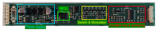 - Red frame: signal conditioning and sampling. A quadruple operational amplifier is used to implement the circuitry described in the preceding sections. A discrete low resistance, low leakage current switch is used to build up the S/H function.