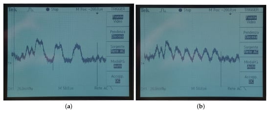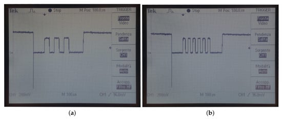 The measurements at the receiving side are instead visible in Figure 9. Due to the strong signal attenuation related to distance between the transmitting and the receiving lamps, only the processed signals just at the input of the microcontroller can be shown, after preamplification, noise cancelling, sampling and filtering. These signals will be then further digitally processed by the microcontroller. On the left, the signal corresponding to a ‘0’ is shown (three pulses), while, on the opposite side, a ‘1’ is received (six pulses at doubled frequency). As it can be easily seen, the signal is clearly emerging from the noise, even if at reduced voltage levels (20 mV). This is a considerable result, given that, at about 5 cm, and, without any kind of shield, there are nodes switching at 600 V, 100 kHz. The equivalent light input signal is about 1 lx.