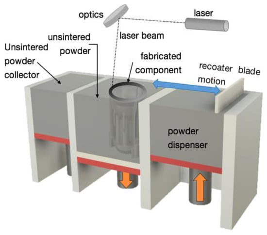 One of the more successful technologies of AM is that of Selective Laser Melting, which is a powder bed fusion process [7,8], as illustrated schematically in Figure 1. The main elements of the Selective Laser Melting process are a leveled bed of metal powder and a focused laser beam that scans the surface of the powder bed according to a digital representation of the desired component, causing localized melting and subsequent rapid solidification. The CAD file of the desired part is converted into an STL file and is subsequently ‘sliced’ into thin cross-sectional layers. Once the laser scans a layer of powder according to the sliced STL file, the powder bed is physically lowered (indicated by the downward orange arrow) a selectable distance in the range of 30–90 microns [1.2–3.5 thousandths of an inch], and a new layer of powder is swept onto the top of the powder bed from the powder dispenser by the recoater blade. The laser beam then scans the new layer with information corresponding to the new geometrical slice and the process is repeated until the three-dimensional (3D) component is fabricated and contained within the lowered powder bed. To retrieve the fabricated component, the powder bed is then raised and excess powder is removed and sieved for recycling if the specific Additive program allows for using recycled powder. It has been shown experimentally that there are no significant differences in elemental concentrations between virgin powder and that recycled powder after eight builds [9]. However, in many cases, flight-worthy hardware is required to be fabricated from virgin powder, leaving the recycled powder to be used for prototypes. More detailed descriptions of Additive Manufacturing can be found elsewhere [10,11,12,13,14,15]. An important consequence of Selective Laser Melting is that due to the ‘selective’, or localized aspect of the melting and subsequent rapid solidification, the resulting microstructure is significantly refined [16], leading to enhanced mechanical properties, such as ultimate strength and yield strength [17].
