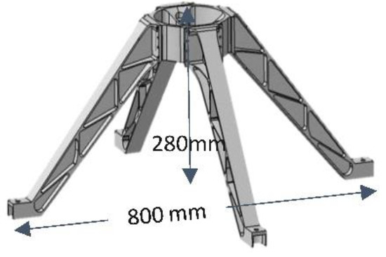 Figure 5 illustrates the nominal geometry of the third case study, which is a system of five parts that are assembled as one part. It serves as a thruster mount for a lunar vehicle intended for launch in the near future as part of SpaceIL’s lunar mission. Once assembled it spans 800 mm in diameter and approximately 280 mm in height. It was chosen as a demonstration of topology optimization of an assembly of parts.