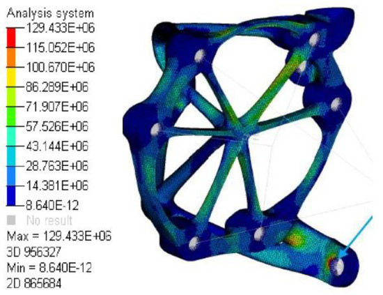 Results of the FEM analysis: Stress plot of the complete engine mount structure subjected to Z excitation.
