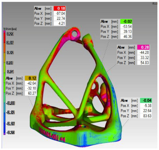 Additionally, a 3D model of the fabricated components was generated with the CT scan data and compared to the nominal CAD file from which it was fabricated. A comparison of the two files was used to generate a heat map illustrating any geometric deviations as compared to the allowables set forth from the customer.