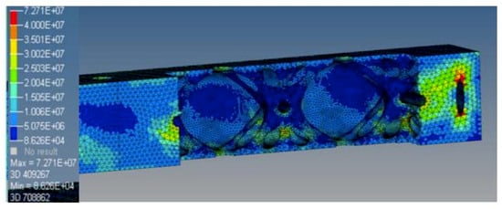 Results of the FEM analysis: Stress plot of the complete engine mount structure subjected to x/y excitation.
