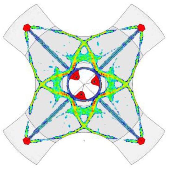 Preliminary explorations of the topology optimization exercise indicated that in order to satisfy the loading and stiffness requirements, the solid legs of the original nominal design (Figure 5) tended to split into three separate branches, each of which attached to the central hub. It was also discovered that the optimization routine sought solutions in which the branch type structures attached to the central hub at two elevations, arranged as far as possible from each other. Hence, it was decided to explore this avenue of topology optimization and to study whether this solution was mechanically viable. These results also enabled a reduction of the design volume in further optimization runs for the sake of computational effort and for the assessment of the viability of certain design solutions. The design space (gray shaded region) for the topological optimization exercise of the lunar launcher engine mount and the preliminary optimization result that fulfills the strength and stiffness requirements is illustrated in Figure 16 and Figure 17. Figure 16 is the top view illustrating how each leg is now formed as three branches and Figure 17 is the isometric image illustrating how the legs attach to the central hub. The apparent discontinuities in the solution are due to the density sensitivity chosen for the image.
